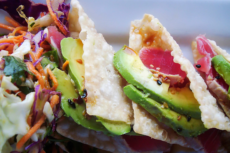 Other: Split the avocado in half, remove the pit, scoop out the flesh, and slice it thinly. Divide the tuna and avocado slices evenly among the shells, and line up four tacos on two serving plates.